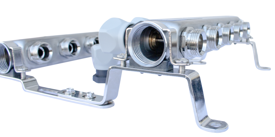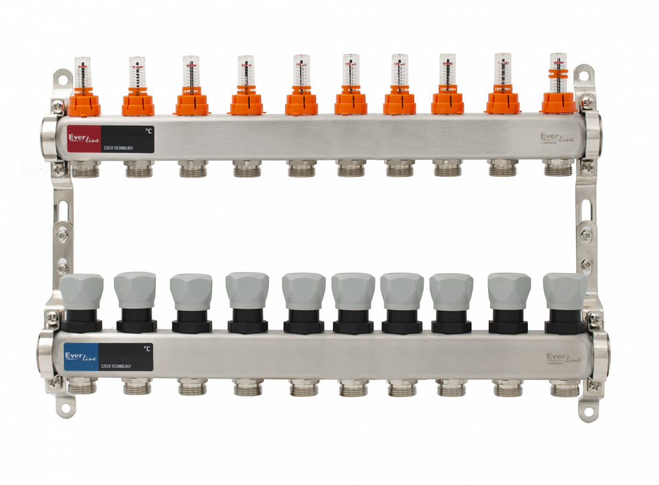 Áramlásmérős osztó-gyűjtő INOX 10 körös, hőmérséklet kijelzővel 1"x3/4"